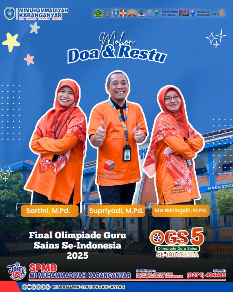 Seluruh keluarga besar MI Muhammadiyah Karanganyar memohon doa restu dari Bapak/Ibu dan teman-teman semua, semoga Allah SWT memberikan kemudahan, kelancaran, dan kesuksesan bagi tim MI Muhammadiyah Karanganyar dalam babak final nanti, serta pulang membawa hasil terbaik.