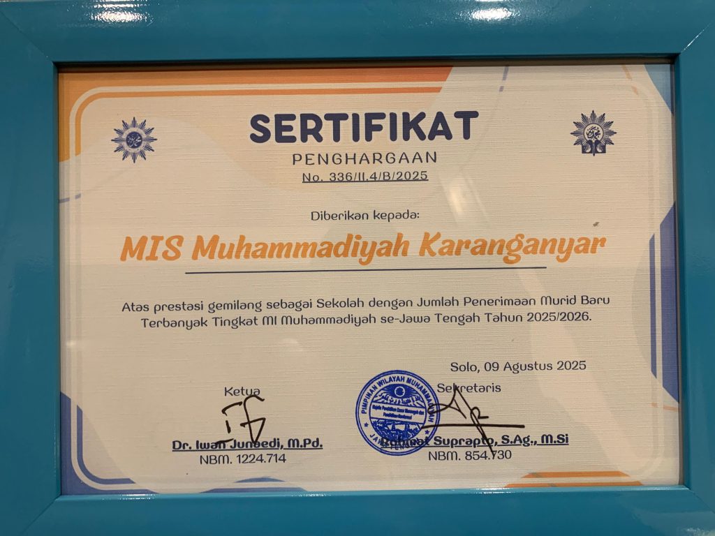 Karanganyar – Prestasi membanggakan kembali diraih oleh MI Muhammadiyah Karanganyar. Pada tahun ajaran 2025/2026, sekolah ini berhasil memperoleh penghargaan sebagai Sekolah dengan Jumlah Penerimaan Murid Baru Terbanyak Tingkat MI Muhammadiyah se-Jawa Tengah. Penghargaan ini diberikan oleh Majelis Pendidikan Dasar Menengah dan PNF Pimpinan Wilayah Muhammadiyah Jawa Tengah.