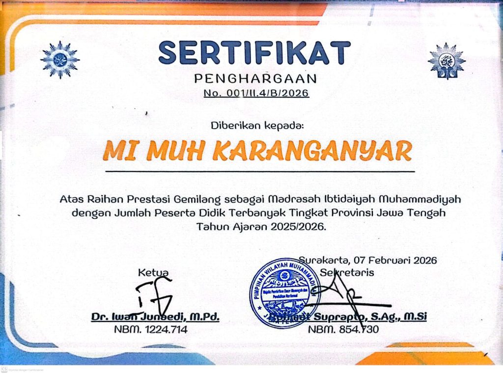 Dengan penghargaan ini, MI Muhammadiyah Karanganyar semakin meneguhkan komitmennya sebagai lembaga pendidikan yang berorientasi pada kualitas, prestasi, dan pembentukan generasi berakhlak mulia.